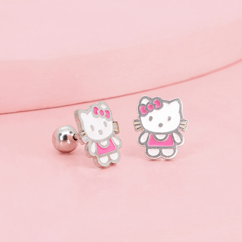 Arete Hello Kitty con vestido esmaltada con broche enroscable, elaborado en plata.