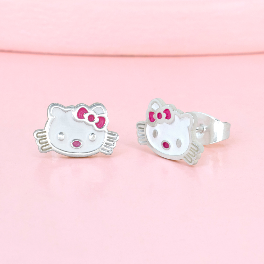 Aretes modelo Hello Kitty con broche presilla, elaborado en plata
