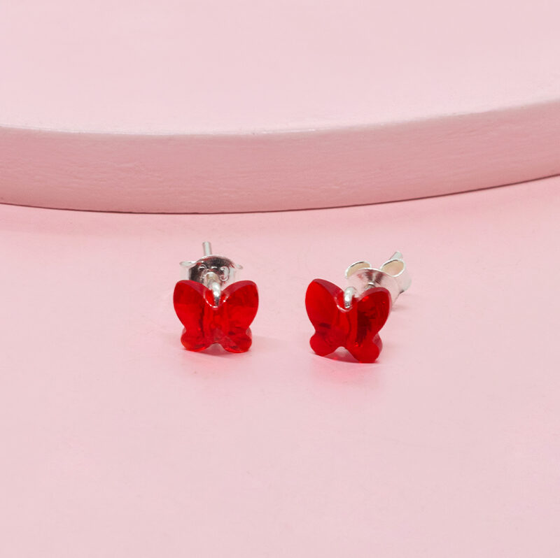 Mariposas rojas de cristal de Swarovski y broche presilla. Perfectos aretes de cambio. Luce un toque de elegancia con estos resplandecientes cristales. Uso ideal para niñas desde 6 años.
