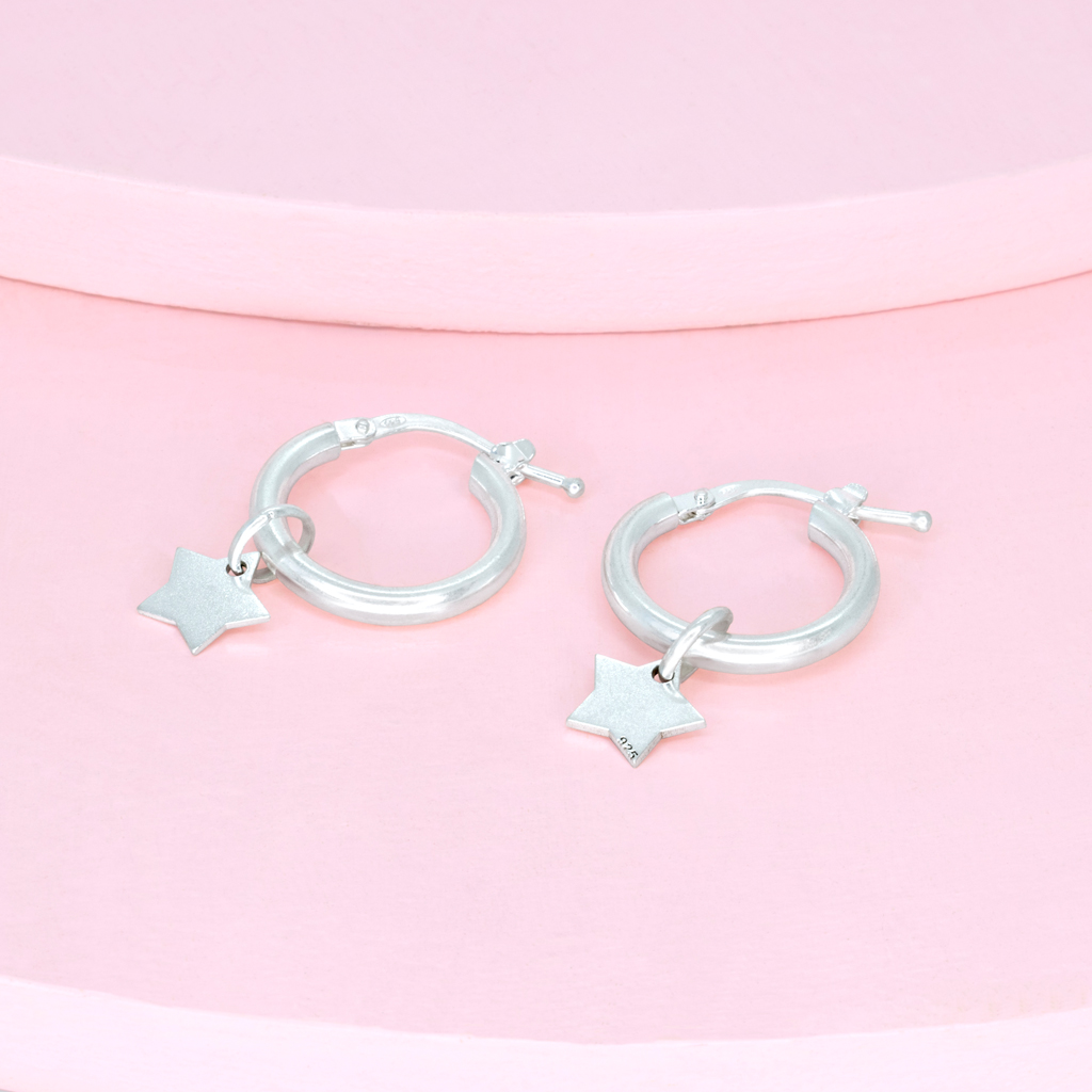 Argollas con broche clic y dije de estrella lisa colgante. Perfectos aretes para poder combinarlos como quieras, 2 en 1. Retira los dijes para un estilo clásico. Uso ideal para niñas desde los 6 años.