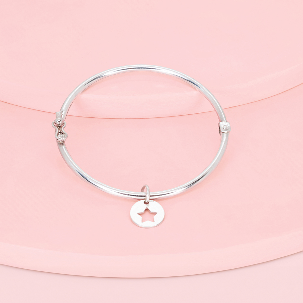 Bangle circular con broche y dije circular plano con estrella calada dentro.