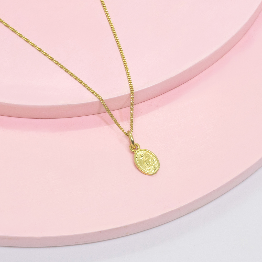Cadena con dije de Virgen María ovalada. Este, simboliza la constante esperanza y los milagros que se pueden experimentar a través de la fe.