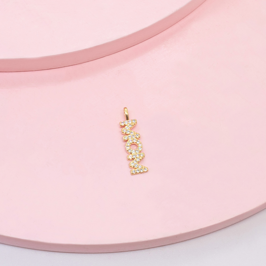 "MOM" de forma vertical con zircones blancos. Perfecto accesorio para tu joya. Tributo elegante al amor maternal.