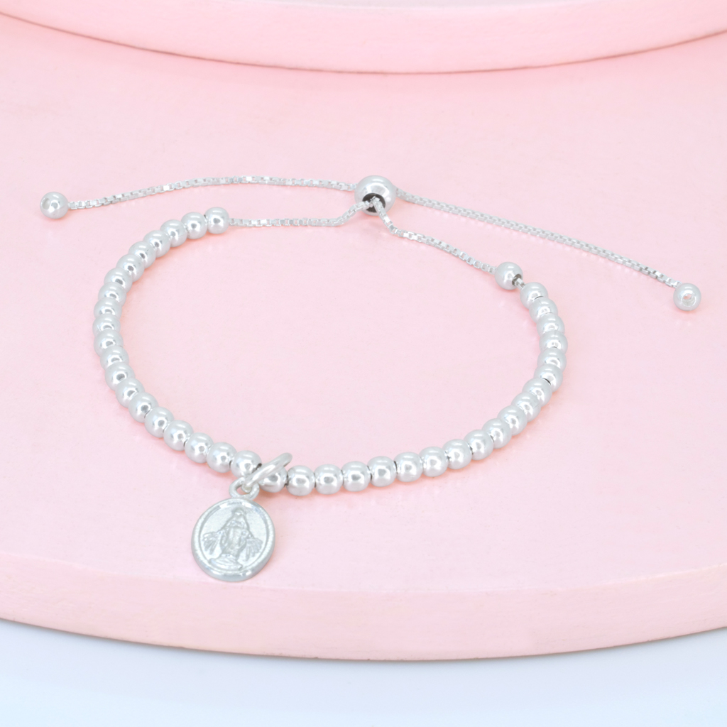 Pulsera Anika regulable con dije Virgen Milagrosa, elaborado en plata