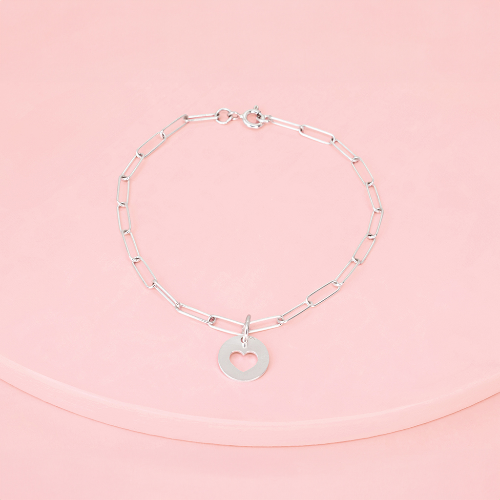 Pulsera Clip con broche, el cual puede adaptarse a cualquier eslabón para adecuarse a la muñeca y dije de circulo plano con corazón calado dentro.