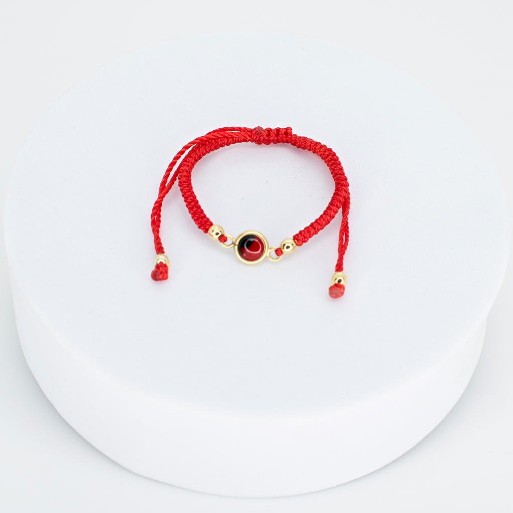 Pulsera protectora tejida a mano con dije de huayruro y aplicaciones en oro 18k, es regulable.