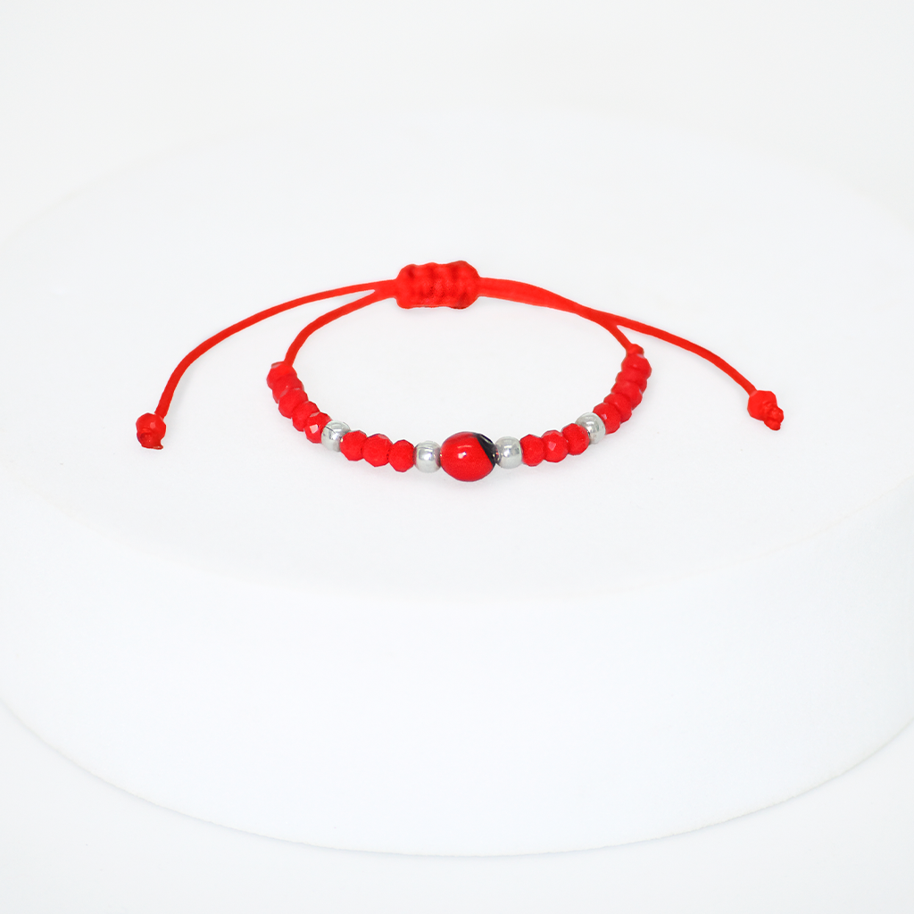 Pulsera de muranos rojos y billas intercaladas con ojo turco rojo de acrílico en medio y broche. El rojo simboliza protección contra el mal ojo y atrae energía, amor, y coraje a quien la lleva puesta.