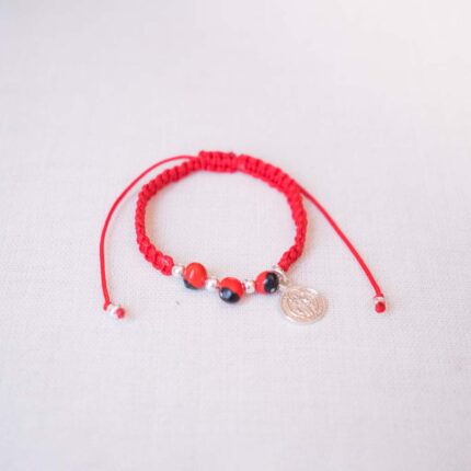 Pulsera de muranos rojos y billas intercaladas con ojo turco rojo de acrílico en medio y broche. El rojo simboliza protección contra el mal ojo y atrae energía, amor, y coraje a quien la lleva puesta.