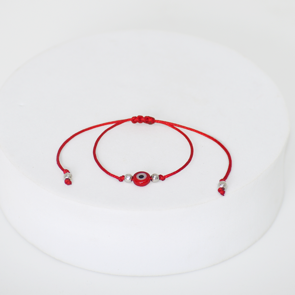 Pulsera de muranos rojos y billas intercaladas con ojo turco rojo de acrílico en medio y broche. El rojo simboliza protección contra el mal ojo y atrae energía, amor, y coraje a quien la lleva puesta.