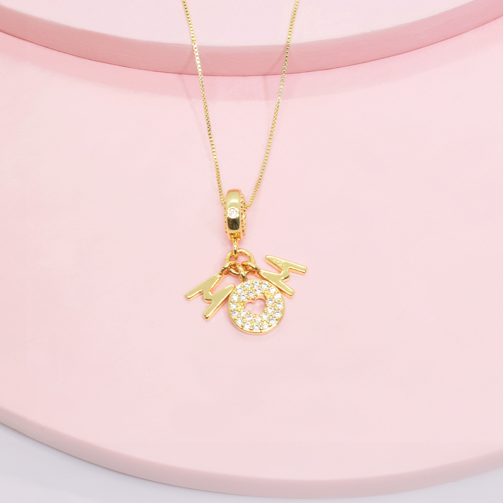 Cadena y Charm "MOM", las "M" son semi bombeadas y la "O" lleva zircones blancos con un corazón calado en medio. Perfecto accesorio para tu joya. Tributo elegante al amor maternal.