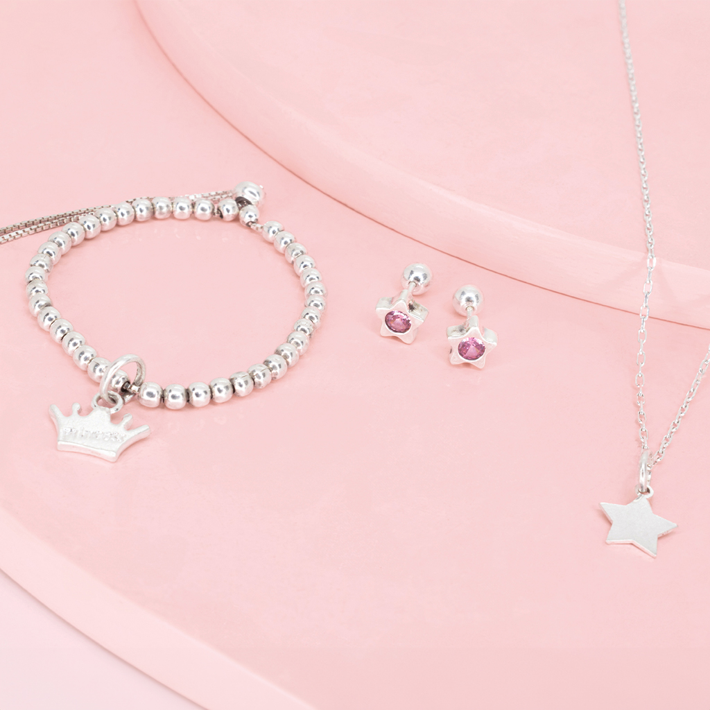 Set; pulsera "Anika"regulable con dije Princess, aretes flor bisel con broche tornillo, el cual es reversible como bombitas clásicas y cadena con dije de estrella lisa.