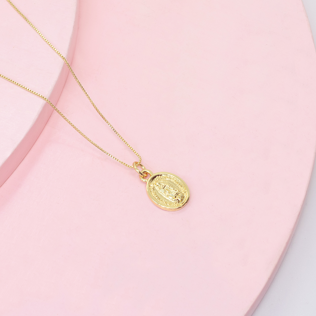 Cadena y dije de Virgen de Guadalupe con relieve. Simboliza la constante esperanza y los milagros que se pueden experimentar a través de la fe. Lleva contigo la presencia amorosa y protectora de la Virgen.